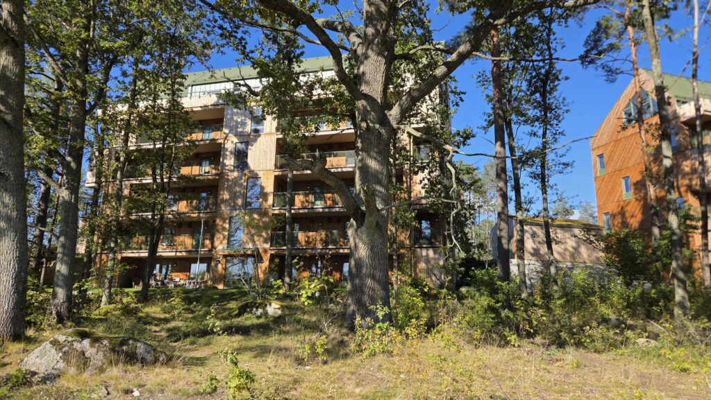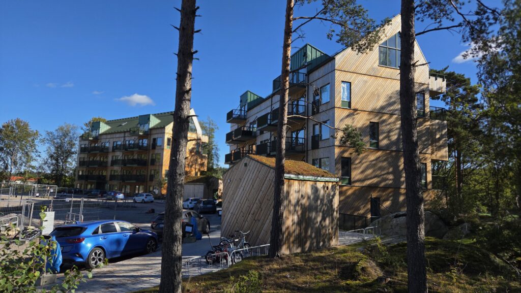 De flera våningar höga husen är byggda helt i trä, något som ställer höga krav både på